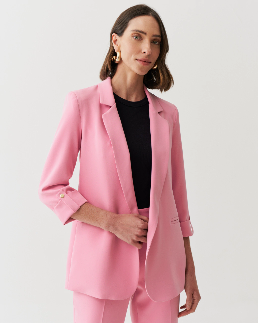 Diferente do blazer tradicional, o Cecília não possui gola nem lapela, o que confere um visual mais clean e atual. Os botões dourados frontais adicionam um toque refinado à peça, enquanto as mangas longas com botões de ajuste permitem o uso também na versão 3/4, oferecendo versatilidade ao look.