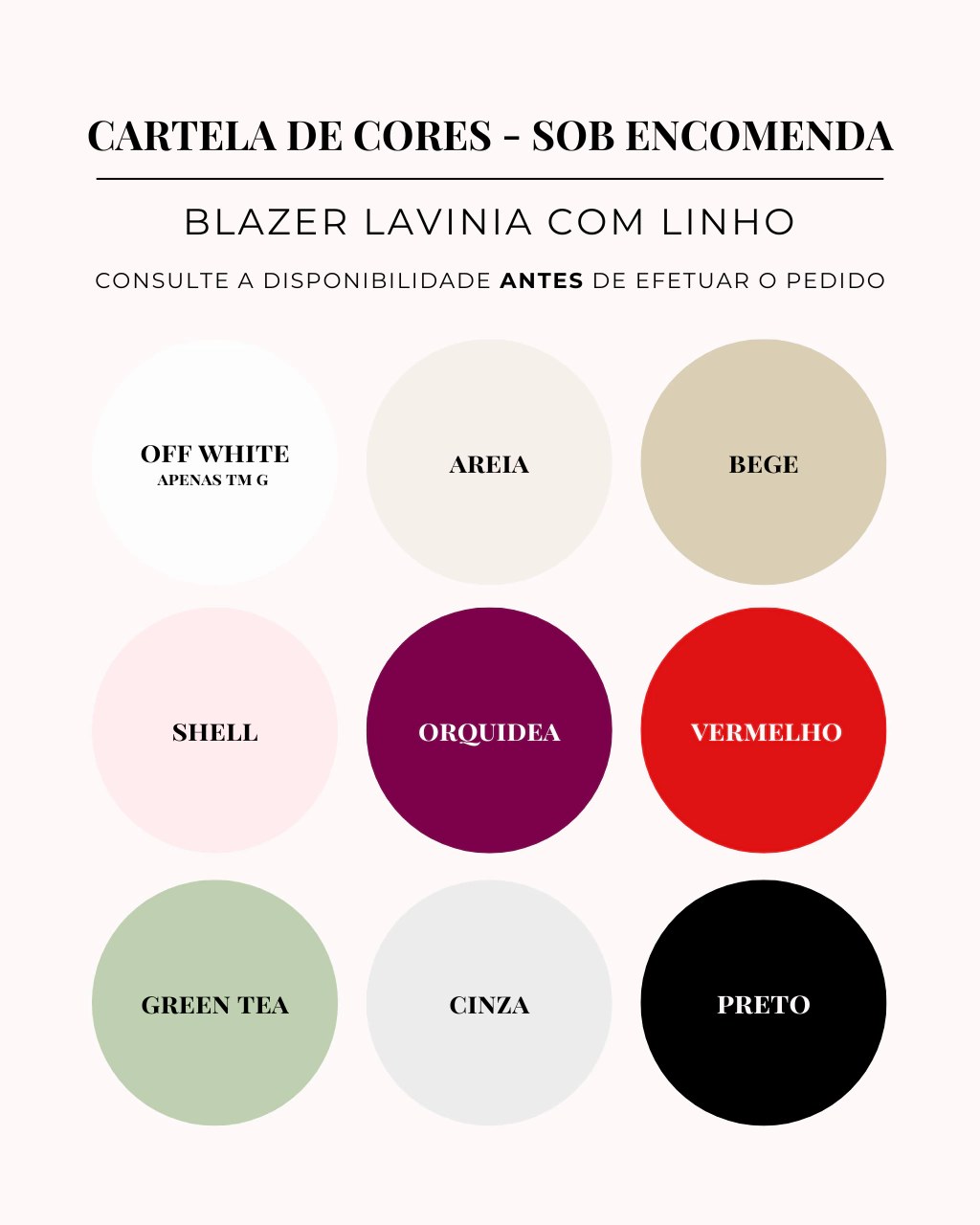 Além das cores sob encomenda, algumas cores disponíveis à pronta entrega podem ter tamanhos esgotados. Nestes casos, é possível realizar a encomenda com envio em até 2 dias úteis.