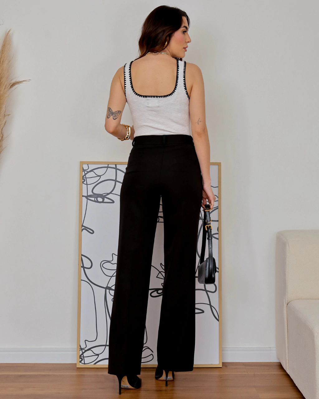 A cintura alta proporciona um caimento alongador e elegante. O fechamento frontal com zíper e botão garante praticidade, e os passantes permitem o uso de cinto para personalizar o visual conforme o estilo desejado.