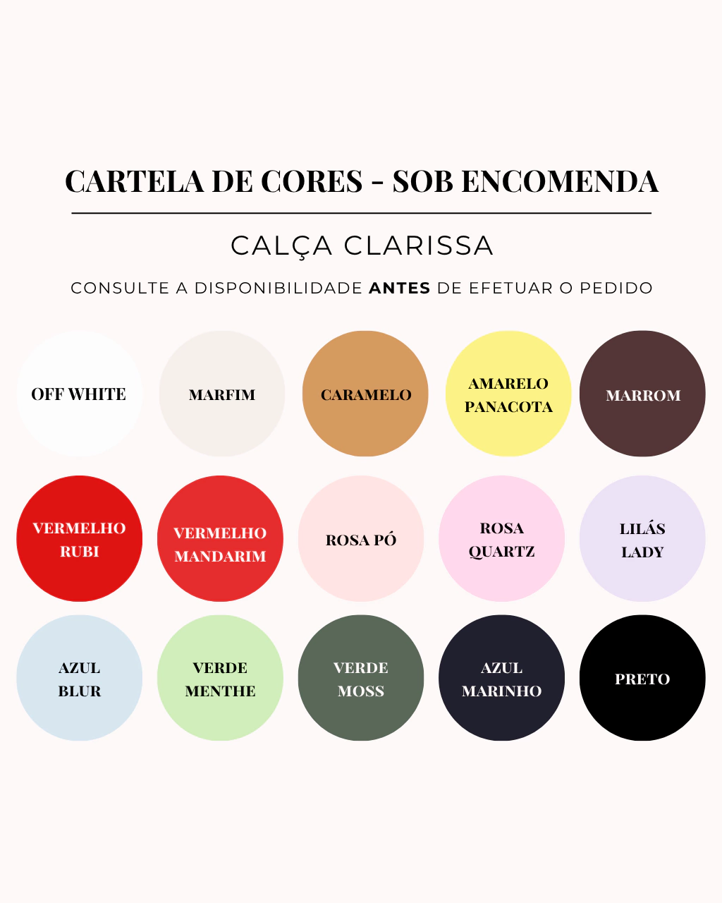 Além das cores sob encomenda, algumas cores disponíveis à pronta entrega podem ter tamanhos esgotados. Nestes casos, é possível realizar a encomenda com envio em até 2 dias úteis.