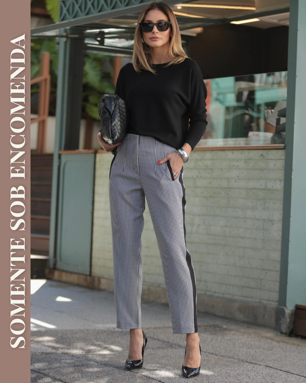 Confeccionada em crepe de alfaiataria com leve elasticidade, a peça oferece caimento fluido, toque macio e liberdade de movimento ao longo do dia. O destaque da peça está na estampa xadrez pied de poule, que traz um ar clássico e sofisticado ao look, além do zíper frontal visível que adiciona um toque contemporâneo.