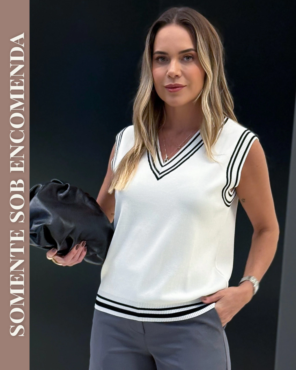 O Colete em Tricot Modal Bicolor é a peça ideal para compor looks modernos, elegantes e versáteis. Com decote V e acabamento contrastante, ele traz um visual sofisticado e atemporal, perfeito para combinações com alfaiataria, camisas, regatas ou usado sozinho para um styling mais despojado.