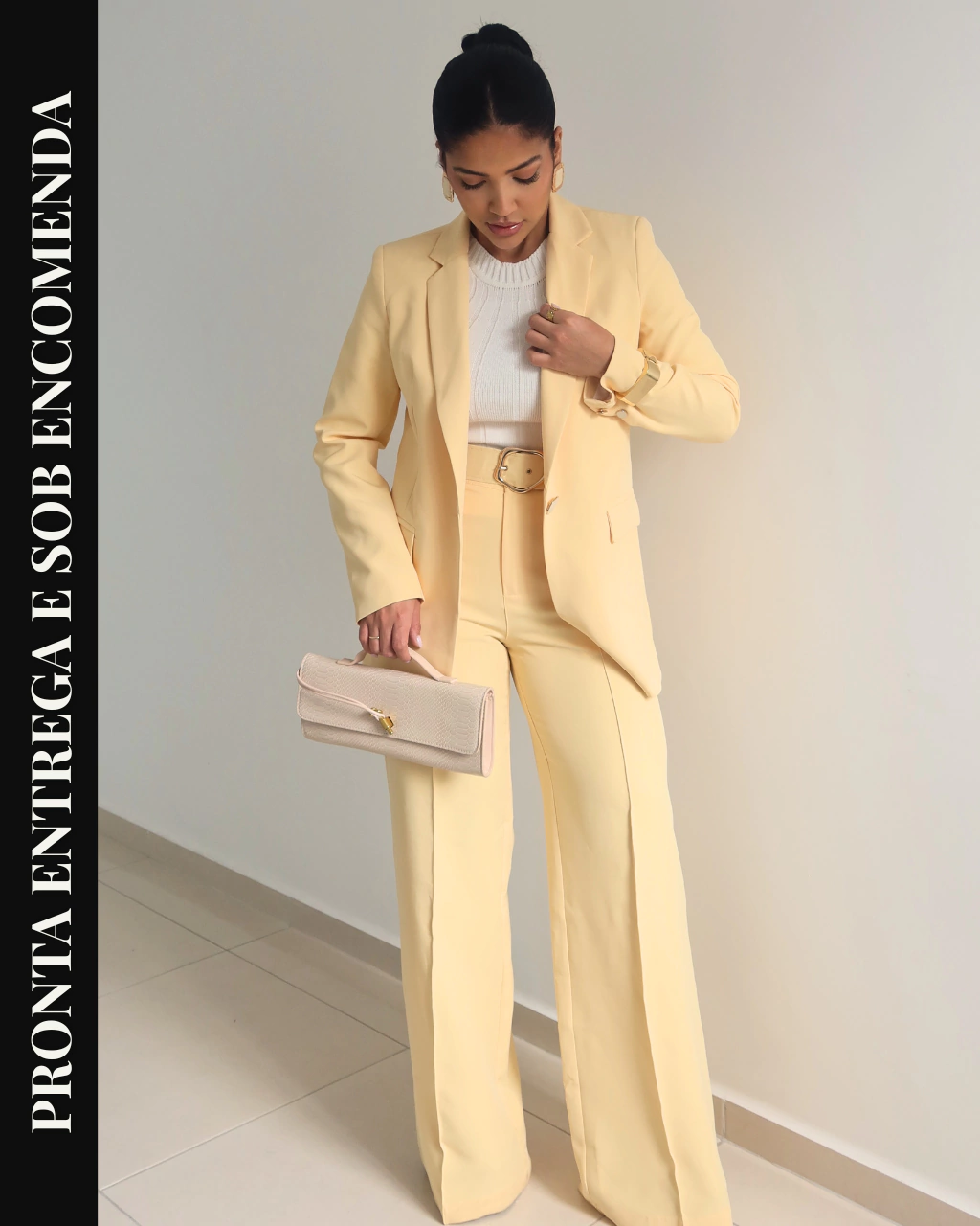 As peças são vendidas no mesmo tamanho, garantindo caimento harmônico e visual uniforme. Caso prefira tamanhos diferentes para blazer e calça, você pode adquiri-los separadamente [clicando aqui].