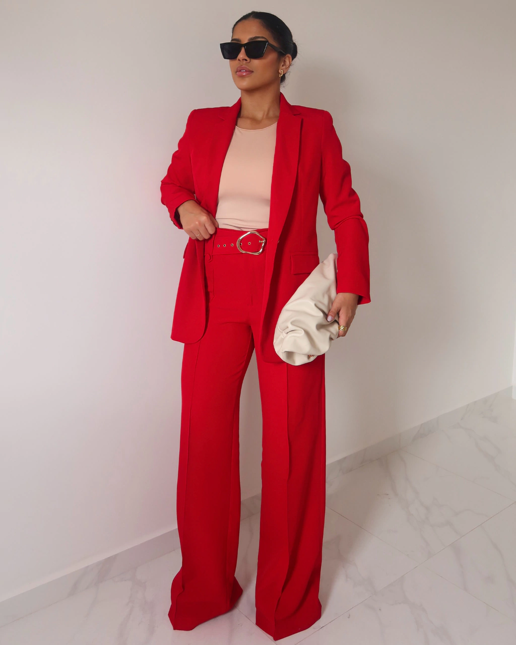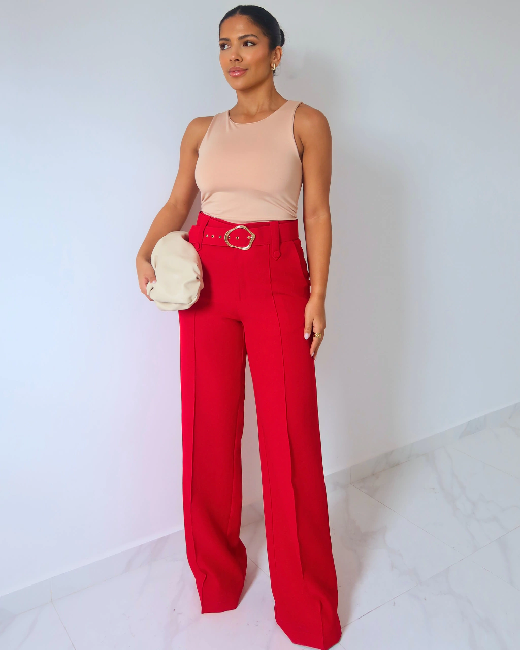 A Calça Pantalona com Cinto é perfeita para quem busca elegância e conforto em uma única peça. Com cintura alta e modelagem ampla, ela alonga a silhueta e proporciona sofisticação instantânea ao look. Seu tecido de crepe de alfaiataria proporciona caimento impecável e toque macio, enquanto o cinto removível com fivela dourada valoriza ainda mais a peça. Use com ou sem o cinto, troque por outro ou combine com acessórios — a versatilidade é garantida.