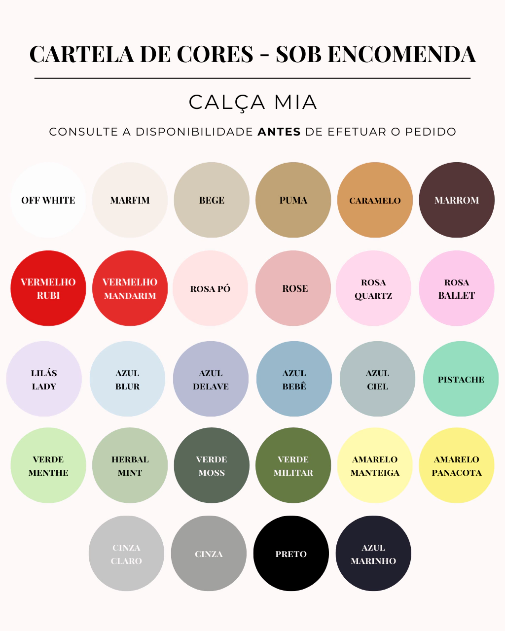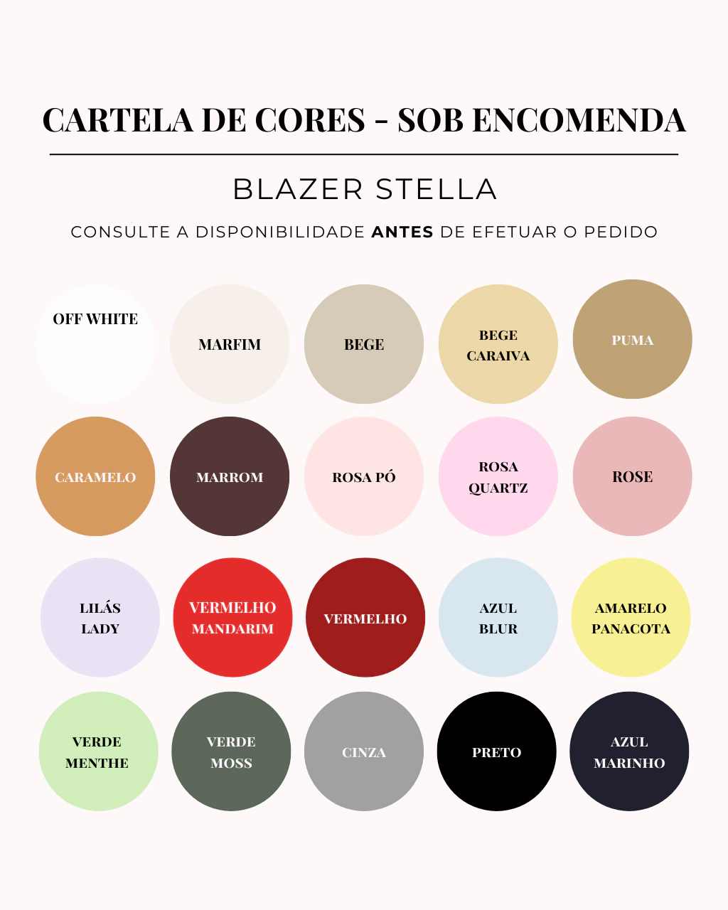 Esta peça está disponível em cores à pronta entrega e em uma cartela de cores sob encomenda (veja na última imagem). Se algum tamanho estiver esgotado no site, é possível encomendar com envio rápido em até 2 dias úteis, mediante disponibilidade.