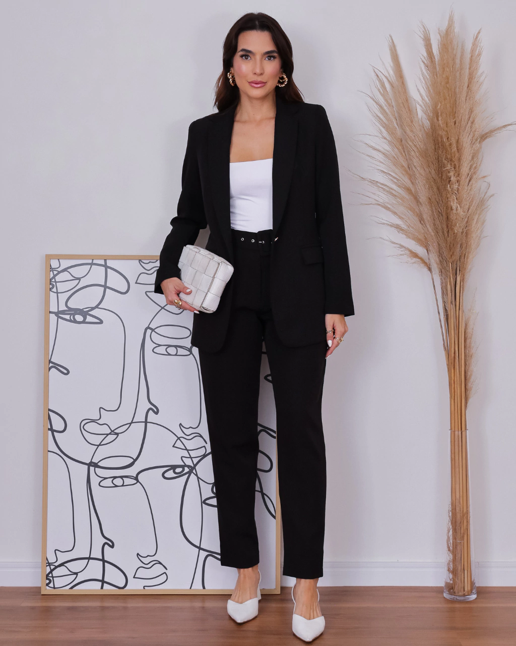 Adquira o visual completo com um único clique. Este conjunto exclusivo reúne duas das peças mais desejadas da nossa alfaiataria premium: o Blazer Alongado Stella com Botões em Madrepérola e a Calça Mia com Cinto Forrado, formando uma combinação elegante e sofisticada.