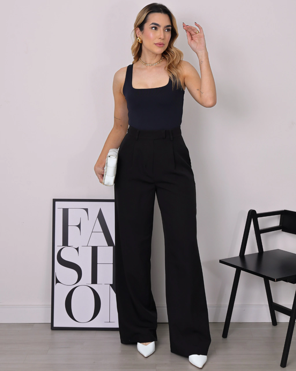 • Modelo: Calça pantalona de alfaiataria com cintura alta e corte reto