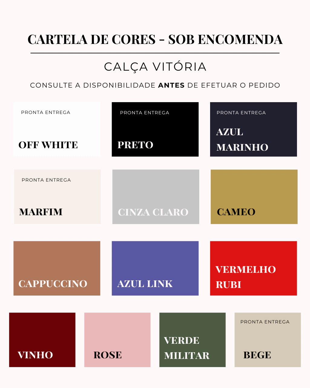 Esta peça está disponível em cores à pronta entrega e em uma cartela de cores sob encomenda (veja na última imagem). Se algum tamanho estiver esgotado no site, é possível encomendar com envio rápido em até 2 dias úteis, mediante disponibilidade.