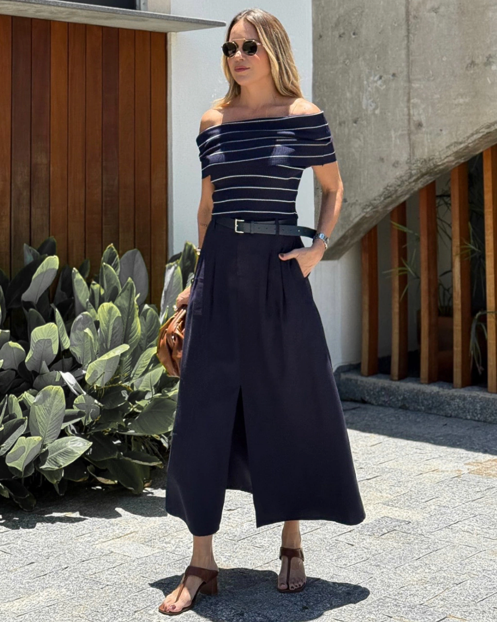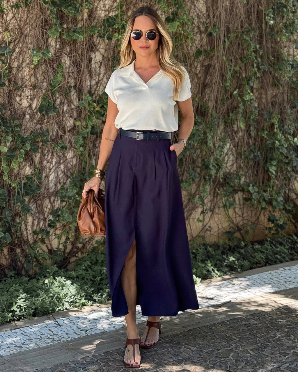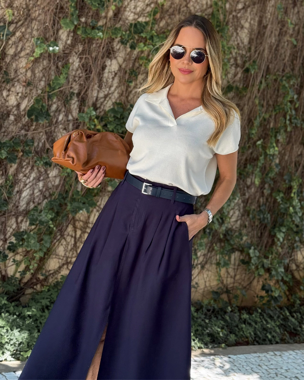 O detalhe da fenda frontal acrescenta modernidade e sofisticação, enquanto o comprimento midi torna a peça versátil para ambientes formais, trabalho ou composições casuais mais arrumadas.